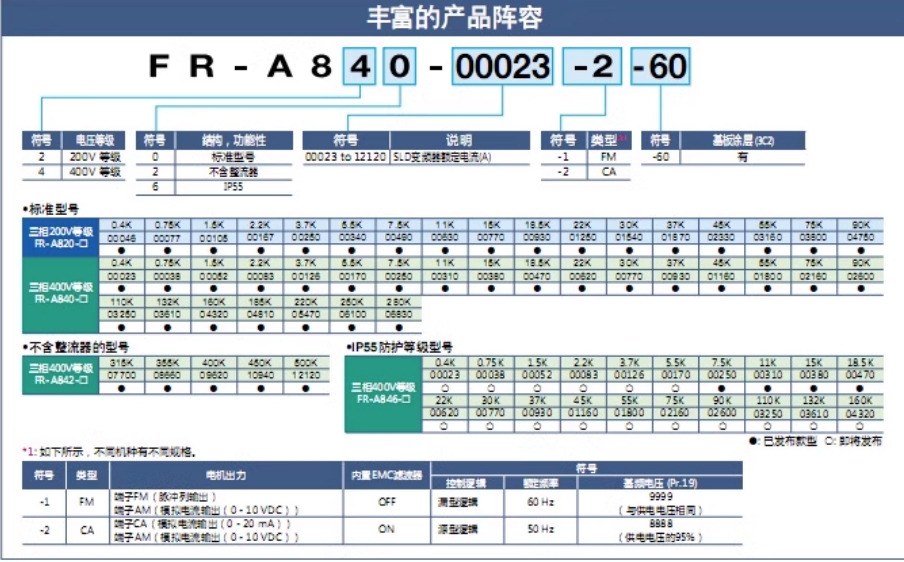 FR-A800系列变频器作为三菱电机全新-一代FirstClass级驱动产品,拥有一流的驱动性能,实时无传感器矢量控制(矢量控制)时,运行频率可达400Hz;具有大转矩启动能力(在0.3Hz的超低转速下可实现200%的最大输出转矩(0. 4-3. 7kW) ) ;同时还可驱动永磁同步电机,从而在满足客户从机械加工、模具铸造到搬送等各种设备的应用的同时,还可帮助客户提高生产力、实现工厂节能。